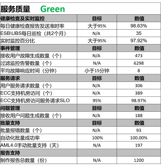 当有2个及以上指标未达到时,服务质量显示为红色